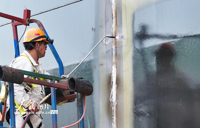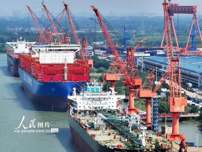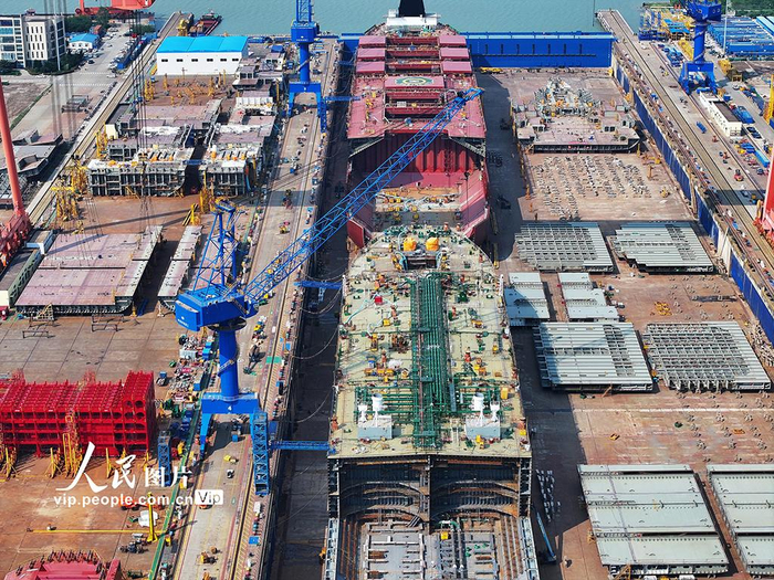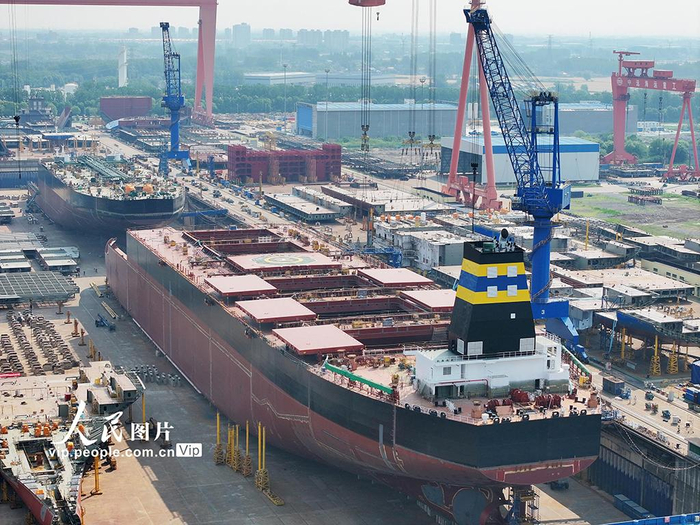 2025年5月26日,位于江苏省扬州市江都区的扬州中远海运重工有限公司厂区一片繁忙景象,工人加紧赶制订单,多艘大型船舶正在紧张建造中。孟德龙摄(人民图片网)