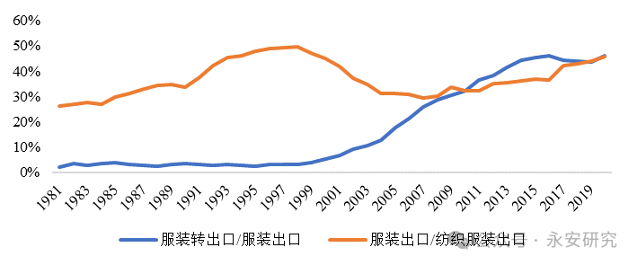 资料来源:公开资料整理,永安期货研究中心以贸易的视角观测各个过去产能大国的转型,可以发日本延伸向上游原料开发,保持了自身在纺织品端的出口竞争力,而欧美转型向下游品牌,服装转出口比例提升。