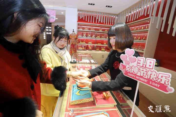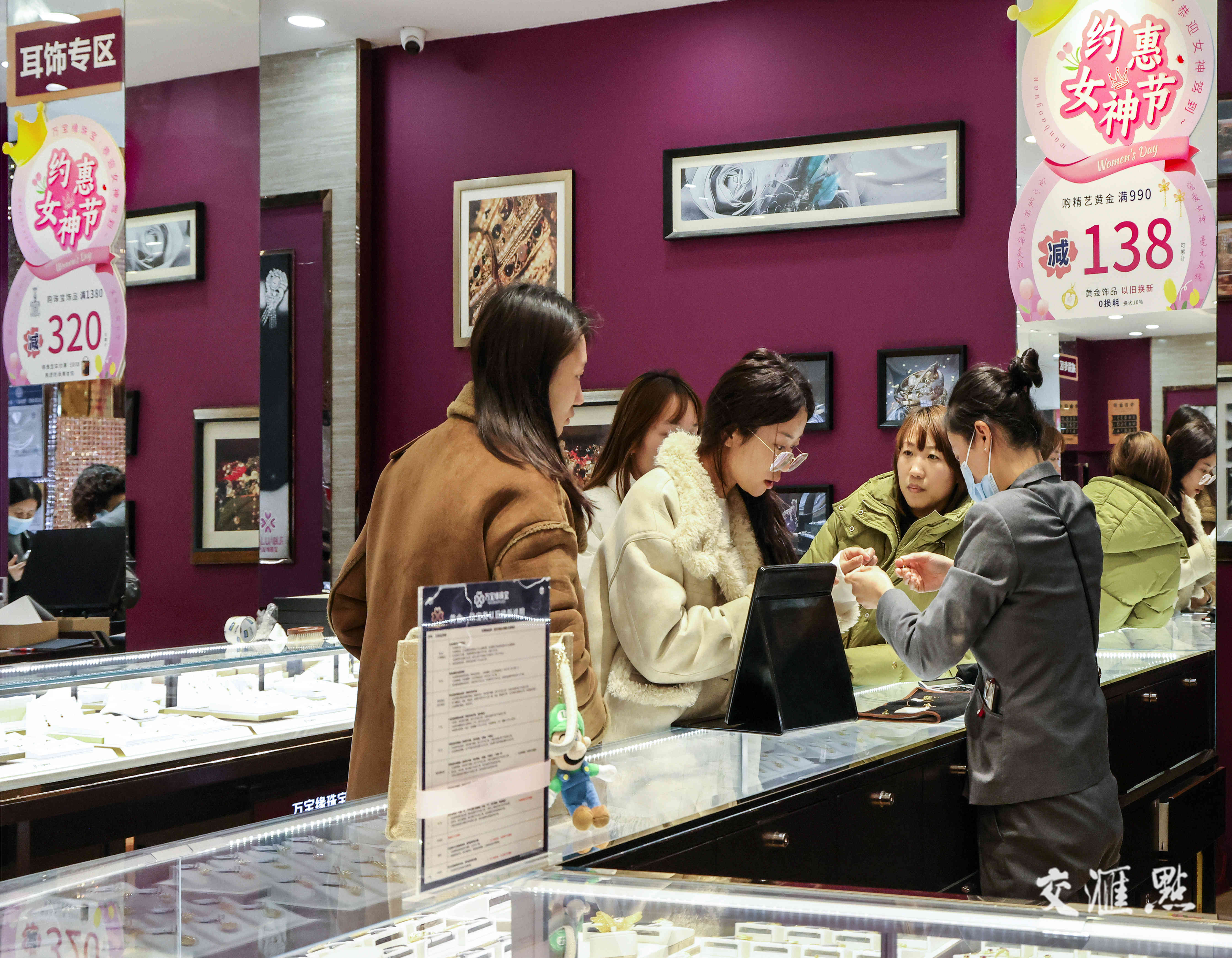 3月6日,女性顾客在苏州观前街龙凤金店选购黄金饰品。随着“三八”妇女节临近,女性消费成为苏州各商家关注的焦点,各种促销活动吸引了众多女性顾客。王建康 摄 视觉江苏网供图