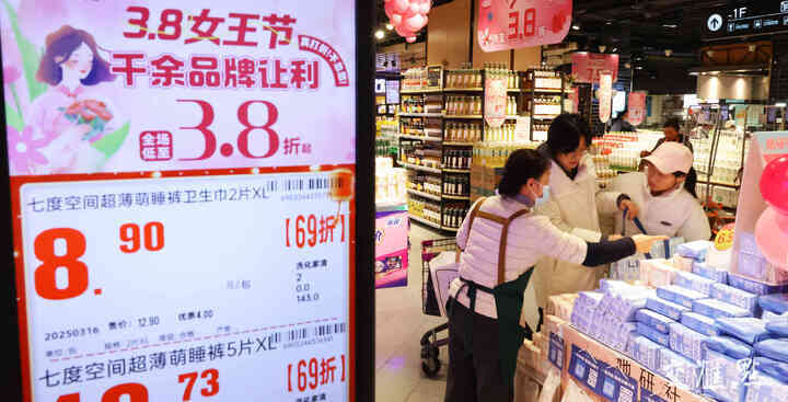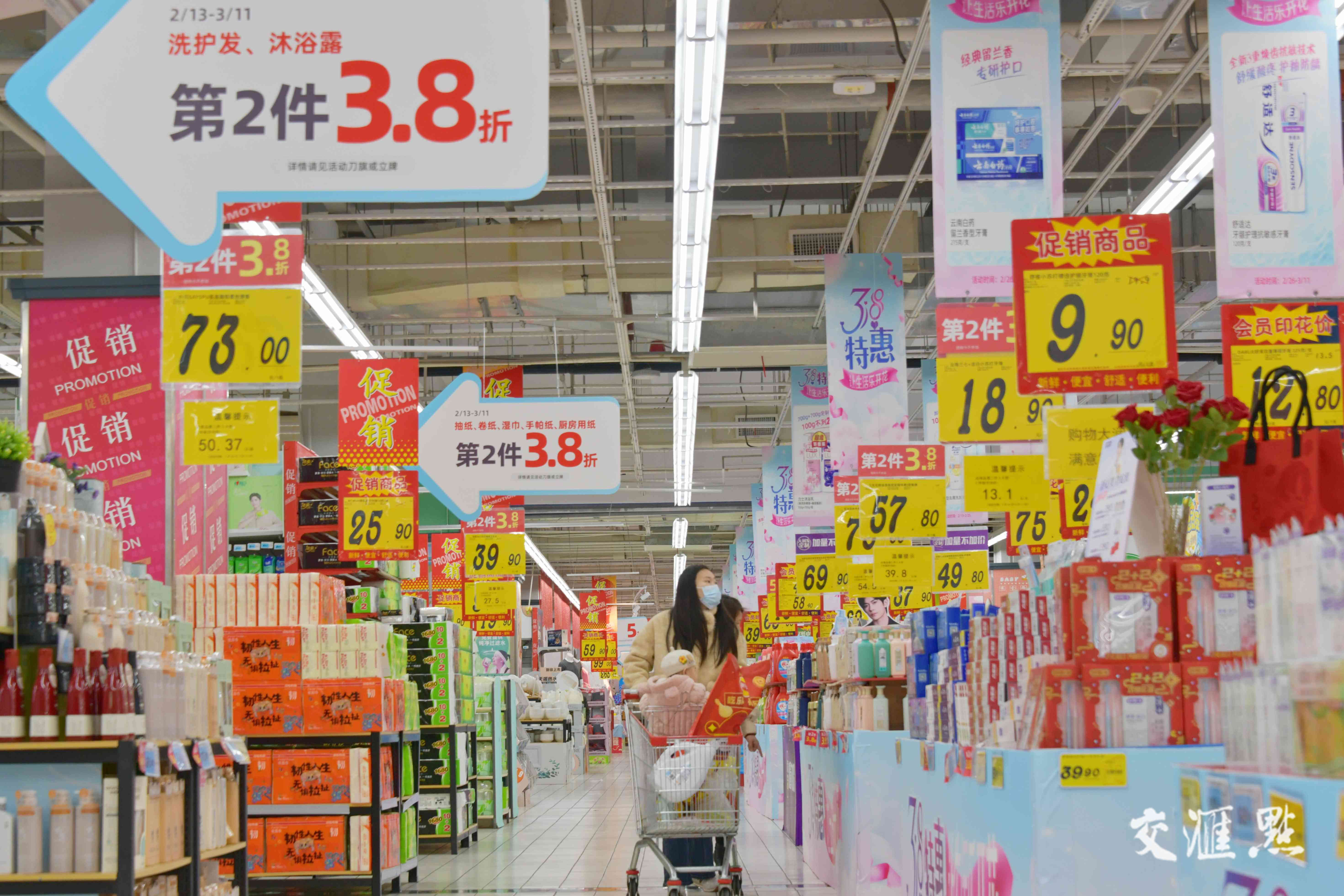3月2日,连云港市海州区一家大型超市,顾客在选购“三八”妇女节专场促销商品。“三八”妇女节将至,连云港市众多实体商超通过升级服务、专场促销、超值嗨购等多种方式,提升现场人气,给女性消费者提供更多的选择和更丰富的购物体验。耿玉和 摄 视觉江苏网供图 策划:田梅