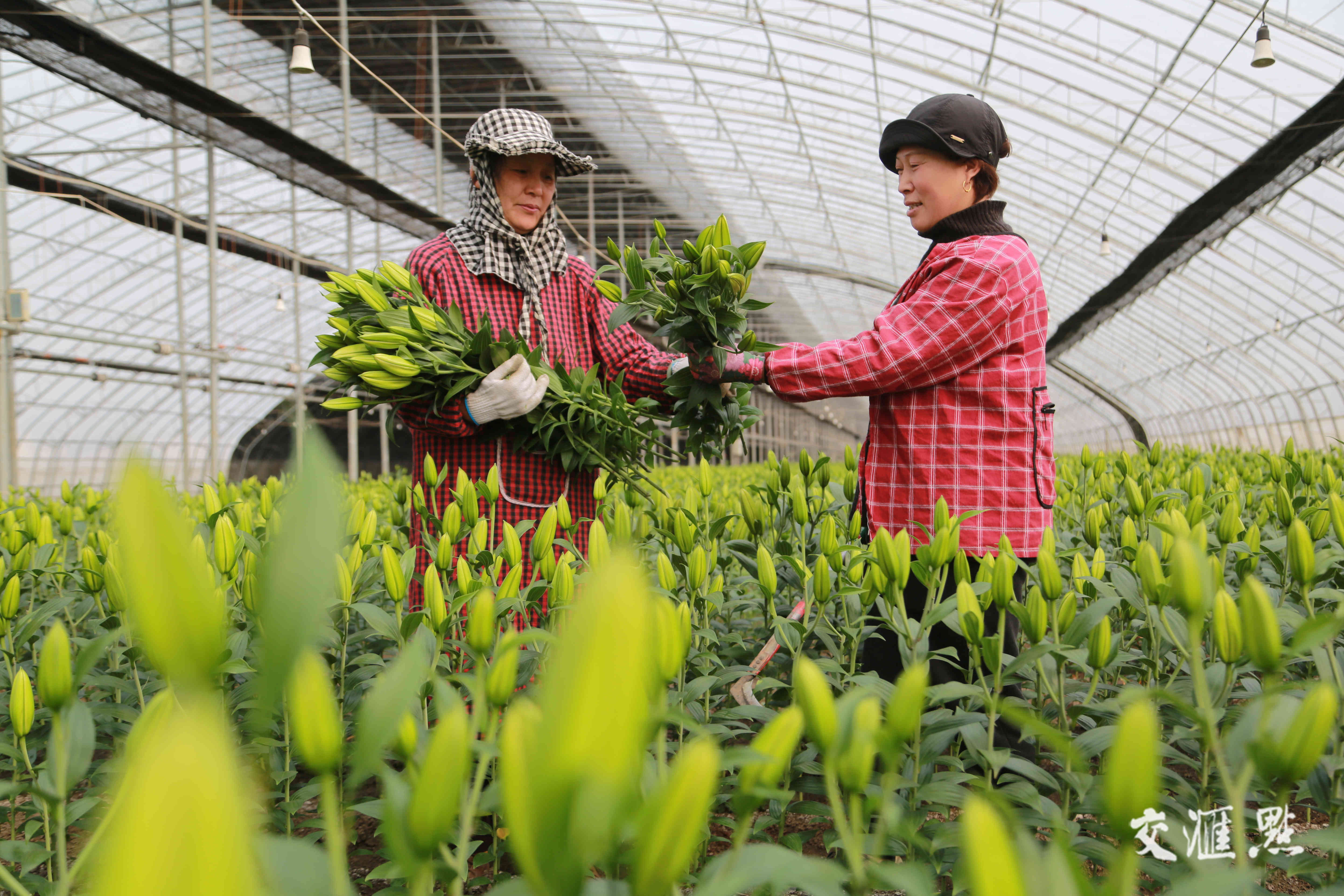 3月7日,连云港市海州区的江苏农垦岗埠农场,花农们在田间加紧采收百合花,供应“三八”妇女节市场。 徐卫 摄 视觉江苏网供图