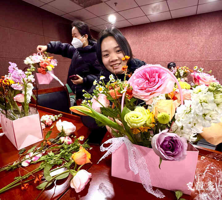 3月6日,三八节期间,宿迁市沭阳县本地商家联动多家单位,推出“春日臻享花艺沙龙”,消费者现场搭配玫瑰、康乃馨等花材,体验插花活动。当地商家以情感体验撬动消费力,助推“她经济”生态扩容升级。任利梅 摄 视觉江苏网供图