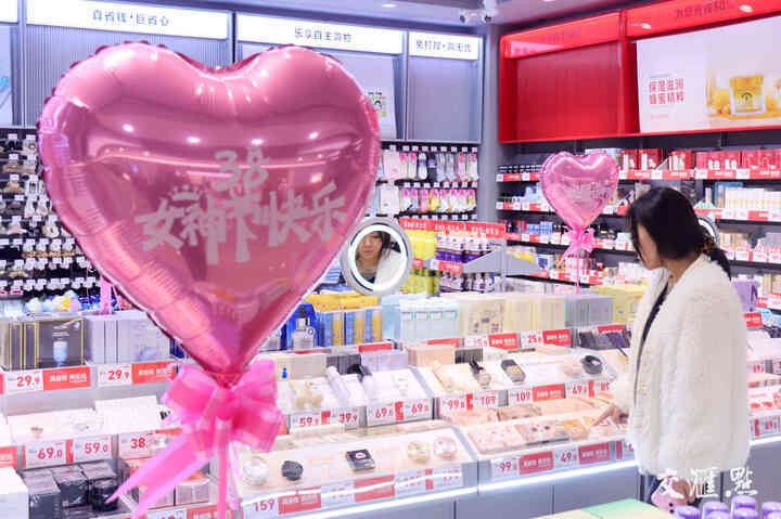3月4日,淮安市洪泽区高良涧街道,商家聚焦女性消费群体,开展美妆、珠宝等系列品类优惠促销活动,点燃“她经济”消费热潮。 崔德圣 摄 视觉江苏网供图