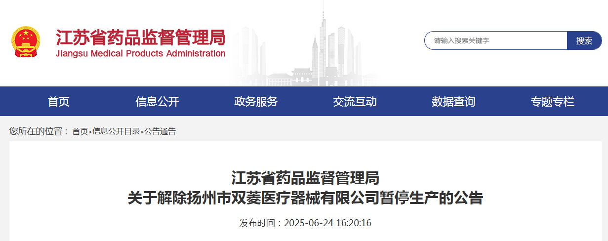 我局于2025年4月7日发布《关于3家医疗器械生产企业暂停生产的公告》,对扬州市双菱医疗器械有限公司采取暂停生产的风险控制措施。鉴于该企业已对检查发现的缺陷进行了整改,现决定解除对扬州市双菱医疗器械有限公司的暂停生产风险控制措施。