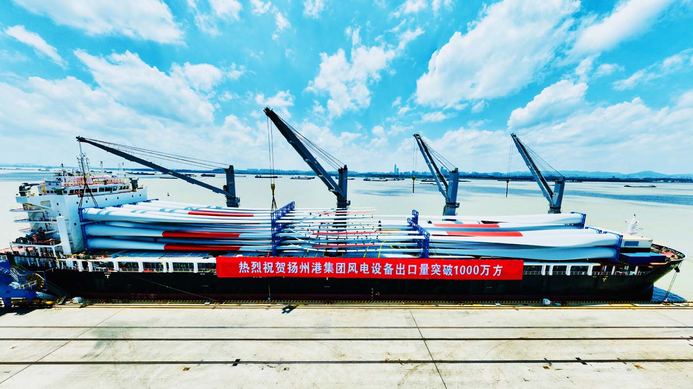 扬州港六圩作业区3号泊位上,货轮满载风电设备整装待发。受访者供图扬州网讯(通讯员 扬港宣 记者 方天 默然 实习生 谢意) 7月9日,扬州港六圩作业区3号泊位,随着“明勤”号货轮完成9套共计7.3万方风电整机设备作业启程前往南非,扬州港风电设备出口装运总量历史性突破1000万方。这标志着扬州港在风电设备综合出口基地建设上实现了新跨越。