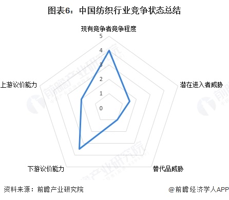 运用波特的“五力”模型,对中国纺织行业的竞争环境进行分析,对各方面的竞争情况进行量化,5代表最大,0代表最小,具体五力竞争分析总结如下: