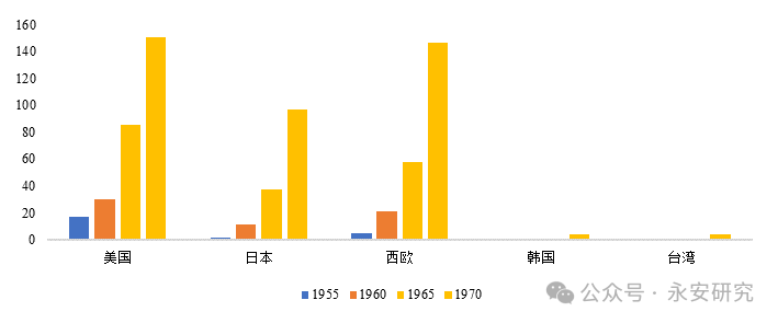 资料来源:《WTO与中国纺织工业》,广发证券,永安期货研究中心与此同时,在以杜邦、法本等欧美化工公司技术创新的推动下,合成纤维实现不断工业化,纺织业也进入新时代。合成纤维自身优质性能以及全球石油化工产业的高速发展推动全球合成纤维行业的爆发式增长,日本纺织业也在这过程中快速崛起。日本棉纺企业凭借技术升级,在生产效率上超越了欧美。据统计1933年日本棉纱业劳动生产效率指数(按劳动每小时棉纱产量编制)达到225,反超美国和英国的165/120(参考自《日本纺织工业生产体系的形成》,国信证券引用)。在此背景下,全球的合成纤维增长主要集中在美国、日本以及西欧三个地区,而以技术为引领的纺织服装出口格局变化也达到了阶段巅峰。
