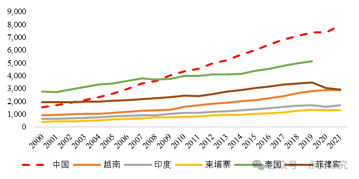 图17:东南亚国家与中国工业增加值对比(百万美元)