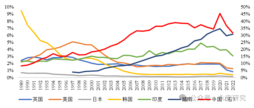 杭州研究中心化工团队摘要:回顾过去全球纺织品服装产业链的变迁,其发展经历了从欧美,到日韩,再到中国,当下逐步扩散至以越南为代表的东南亚地区这些过程,而技术、劳动力资源、贸易壁垒等因素在产业转移中扮演了重要角色。作为当下全球纺织品服装出口主力,中国也逐步进入了转型期,在总量增速放缓大背景下,提升上游原料出口占比以及下游品牌附加值或成为未来主要发展方向,而在结构化发展进程中,聚酯与下游服装后续出口增速的表现或许也会持续分化。正文:1.纺织品服装产业链变迁回顾20年纪90年代以来全球不同国家和地区纺织品与服装出口市占率变化,其背后反应的是全球纺织业的迁移和发展,或者说技术、劳动力与贸易环境的变迁。这一发展历程大致经历了:以英国、美国为代表的欧美地区占据主要出口比重;再到韩国、台湾、香港等东亚地区的承接,而过程中日本在纺织品领域出口同样占据了重要地位;随后便是中国的快速崛起,成为了当之无愧的全球纺织品服装生产主力;而在新的廉价劳动力冲击下,印度、越南等东南亚地区逐渐开始了新的纺织品产业承接。图1:主要国家/地区纺织品出口占比(粗略测算)
