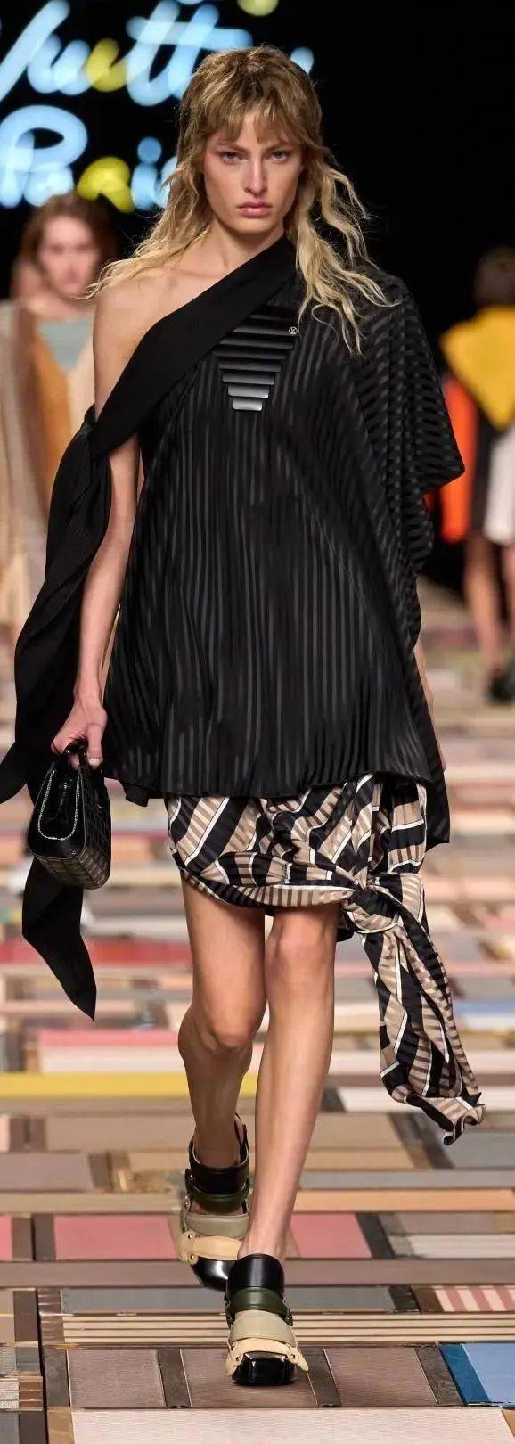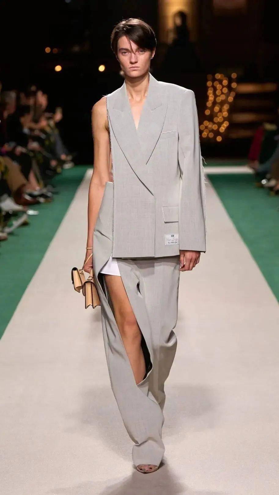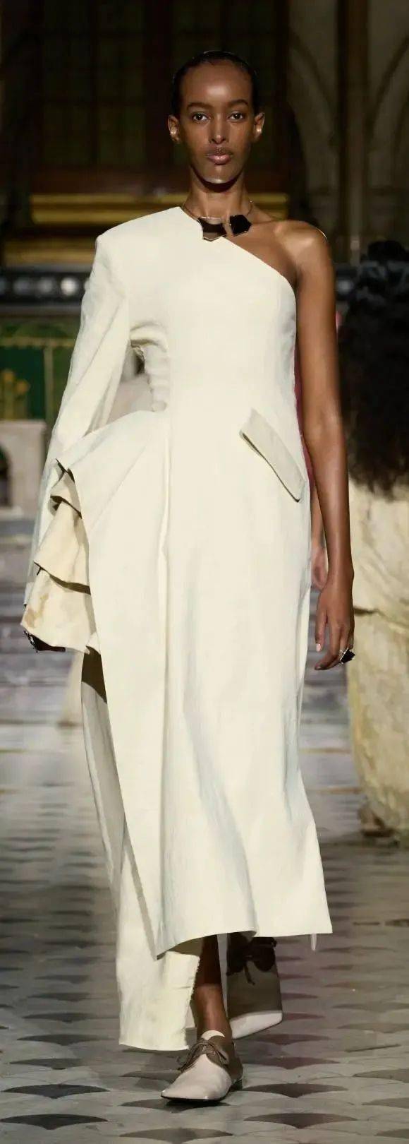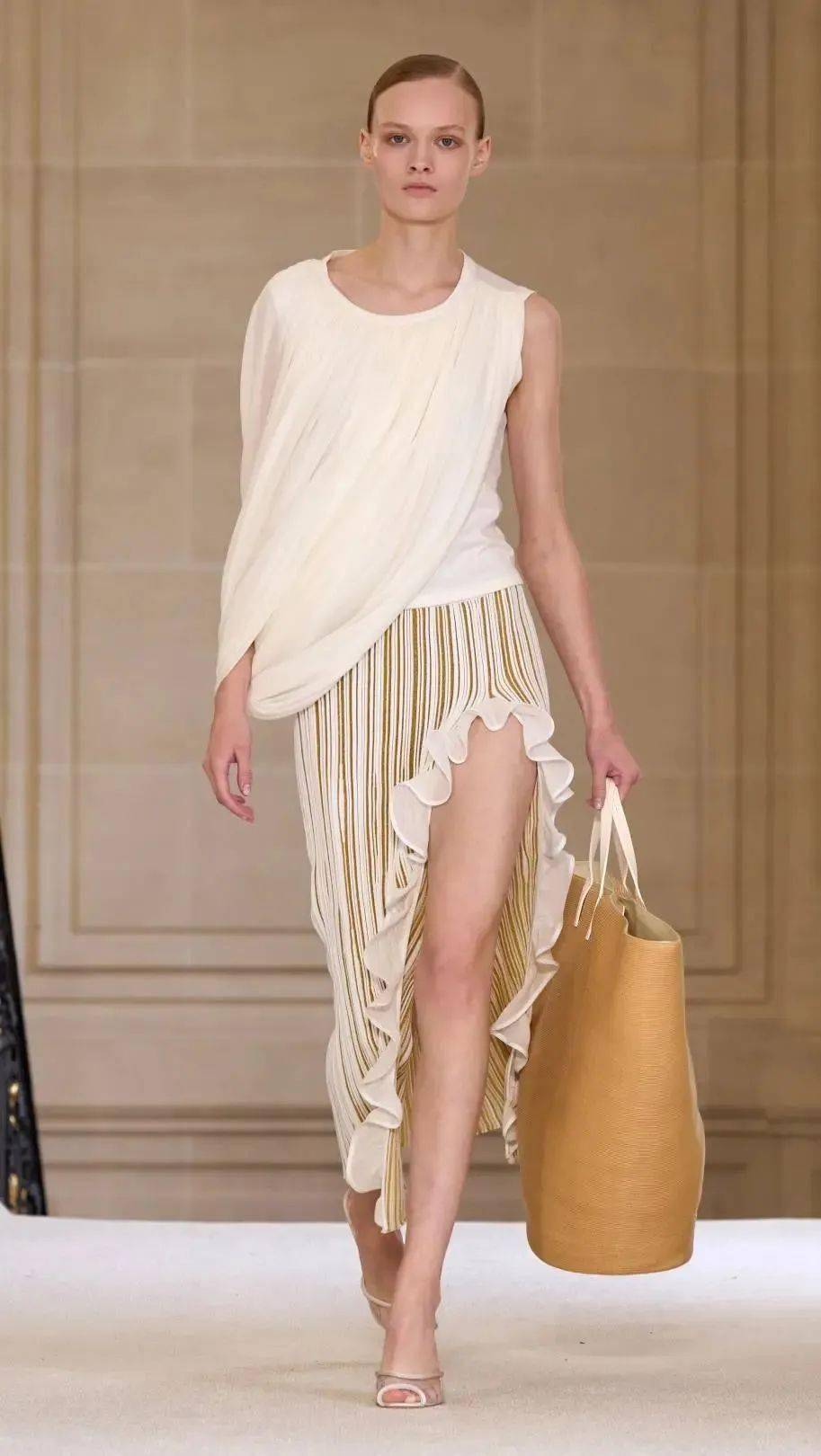 在非正式场合,不对称的设计在2025春夏T台上抢占一席之地。可以体现在廓形结构或者局部设计。