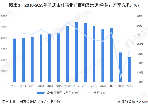从住宅销售面积来看,2010-2021年,重庆市住宅销售面积呈小幅波动状态。2022年重庆市住宅销售面积大幅下降至2723.0万平方米。2023年,重庆市住宅销售面积继续下降至2268.9万平方米。