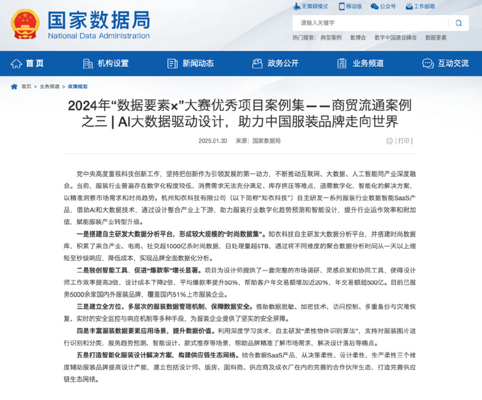 同时,国家数据局还在其官方公众号上对知衣科技的项目进行了专题宣传,详细展示了知衣科技如何通过通过首创全球最大“时尚数据集”、自主研发“柔性物体识别算法”、独创智能设计工具等解决方案,让设计师工作效率提高3倍,成本降2倍,平均爆款率提升50%。