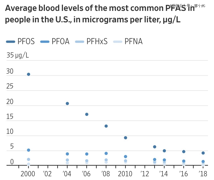 根据美国疾病预防控制中心的说法,所有美国人身上都有不同程度的PFAS,随着21世纪一些公司开始规避使用这种物质,他们发现血液中这种物质的含量也随之下降。