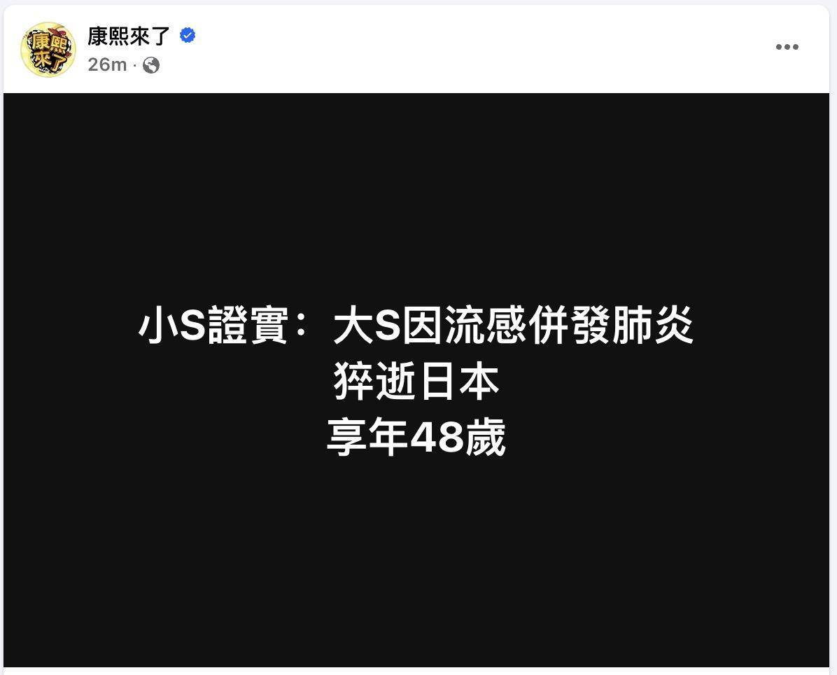 2月3日,《康熙来了》节目组发文称,小S(徐熙娣)证实大S(徐熙媛)因流感并发肺炎,猝逝日本,终年48岁。南都记者了解到,徐熙媛上个月底才现身王伟忠女儿归宁家宴。