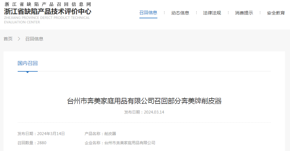 日前,台州市奔美家庭用品有限公司受缺陷调查影响,按照《消费品召回管理暂行规定》的要求,主动向浙江省市场监督管理局和台州市市场监督管理局报告了召回计划,将自即日起,召回2022年5月10日以及2023年8月10日期间制造的奔美牌BM-308型号削皮器产品,涉及数量为2880件。